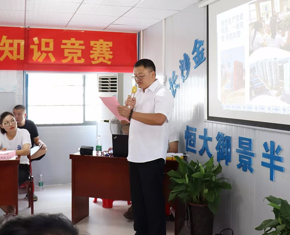 為進一步延伸“安全生產(chǎn)月”活動,全面貫徹黨的十九大精神,積極響應(yīng)習(xí)近平總書記對安全工作的重要指示和省、市關(guān)于安全生產(chǎn)的決策部署,在公司掀起安全生產(chǎn)學(xué)習(xí)熱潮,營造濃厚的安全生產(chǎn)氛圍。在建黨97周年之際,公司安全生產(chǎn)月活動之時,以公司黨員帶領(lǐng)全體員工開展以“生命至上、安全發(fā)展”為主題的安全生產(chǎn)知識競賽在恒大御景半島項目部會議室隆重舉行。
