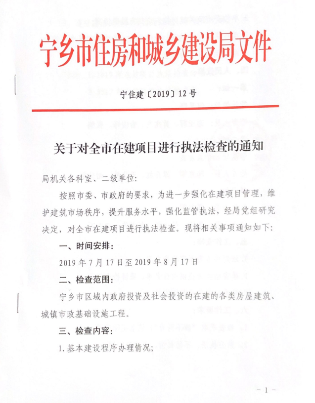 《關(guān)于對全市在建項目進(jìn)行執(zhí)法檢查的通知》(寧住建[2019]12號